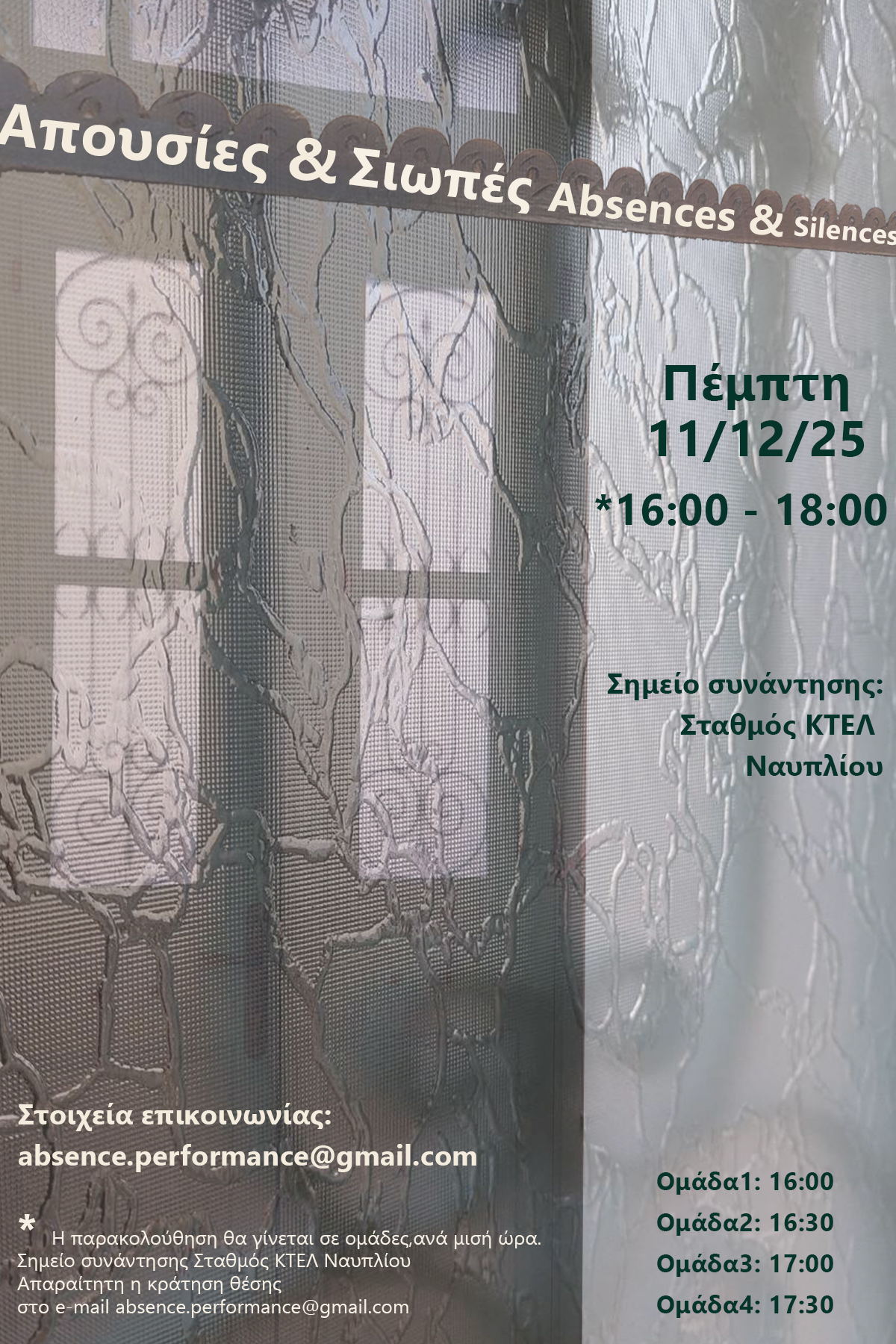 🔴 Η παρακολούθηση θα γίνεται σε ομάδες και θα διαρκεί 30’. Απαραίτητη η κράτηση θέσης στο 📩 e-mail: absence.performance@gmail.com.